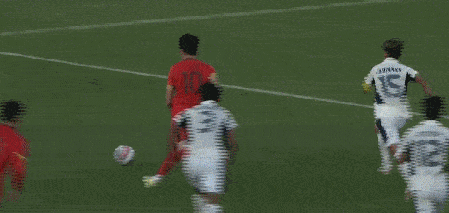 第45分钟,国足快速反击,朱鹏宇弧顶摆脱后射门稍稍打高。