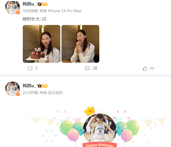 中国女篮内线核心韩旭更新社媒,晒出自己手捧蛋糕的照片凯狮优配,为自己的26岁生日庆生,并且配文写道“按时长大。”